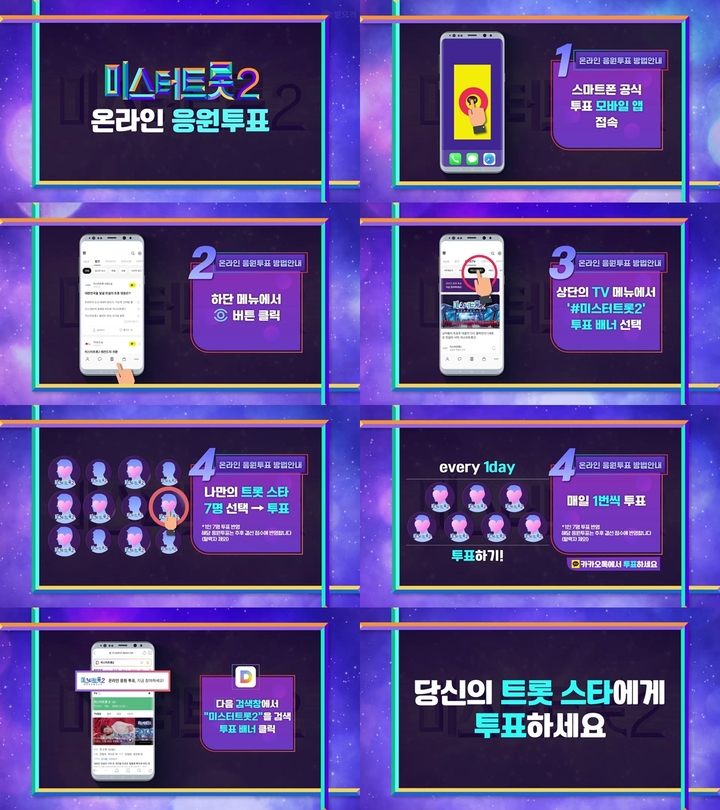 투표방법은 카카오톡 로그인 후 하단 메뉴에서 세 번째 버튼을 클릭한 후 '카카오TV' 메뉴에서 '#미스터트롯2' 투표 배너를 클릭하고 투표할 7명을 선택한 후 '투표'를 클릭하면 됩니다.