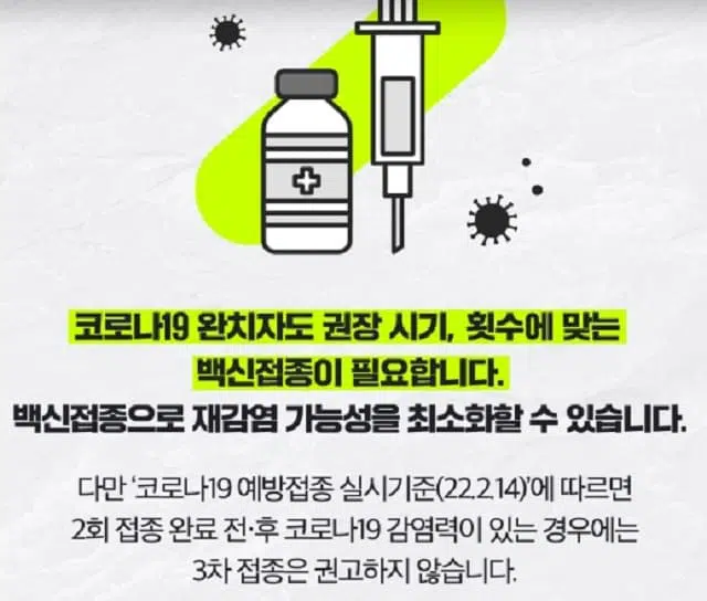 22년 2월 14일 기준으로 2회 접종완료 전 후 감염력이 있는 경우는 3차 접종은 권고 하지 않습니다.